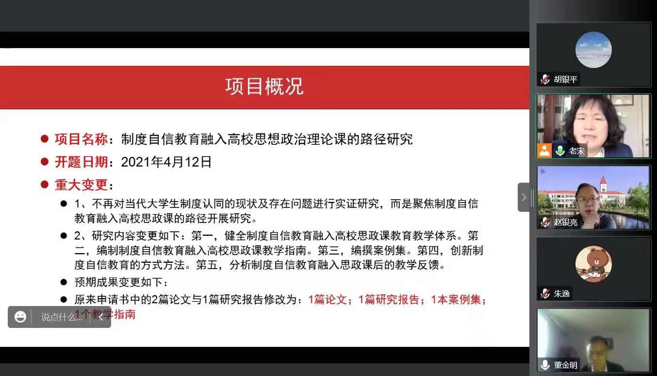 10月16日下午,由宋艳华院长主持的2021年度上海市教育科学研究项目《制度自信教育融入高校思想政治理论课的路径研究》中期答辩会通过腾讯会议举行。上海师范大学赵银亮教授、上海海事大学董金明教授、上海建桥学院科研处朱逸处长参加中期答辩,马院科研秘书胡银平博士与会,答辩会由董金明教授主持。