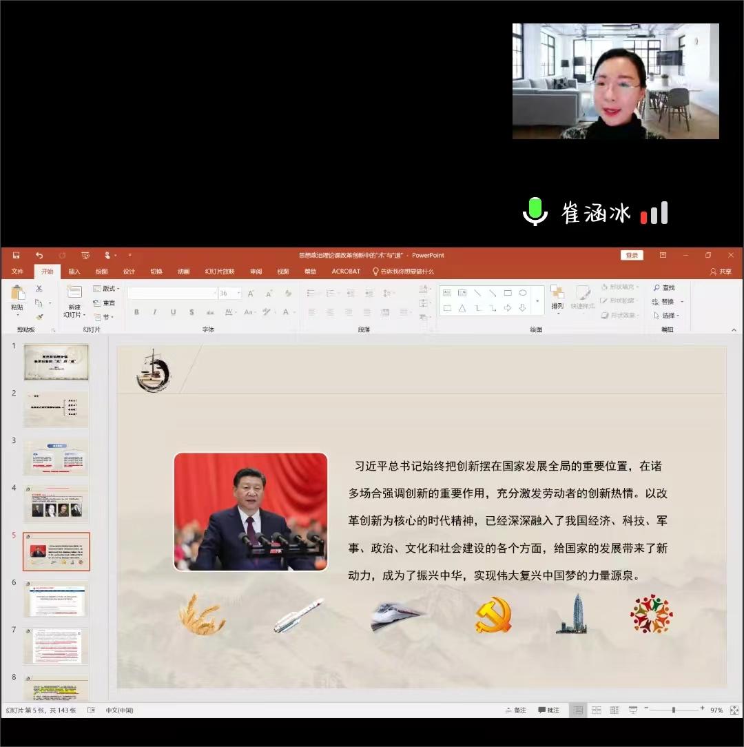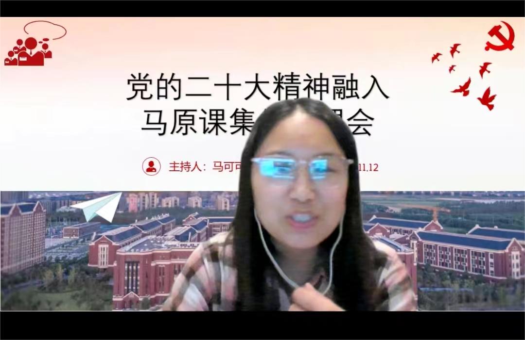 马原课程组邀请本课程组授课经验丰富的朱漪、肖春燕、马可可、严晓岭、余成跃五位老师分章节就党的二十大精神如何融入《原理》课进行了分享。各位老师由浅入深,细致入微的讲述,让与会的老师深刻领会到党的二十大精神内涵可以全方位多角度贯穿于马原的授课过程之中。