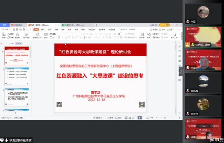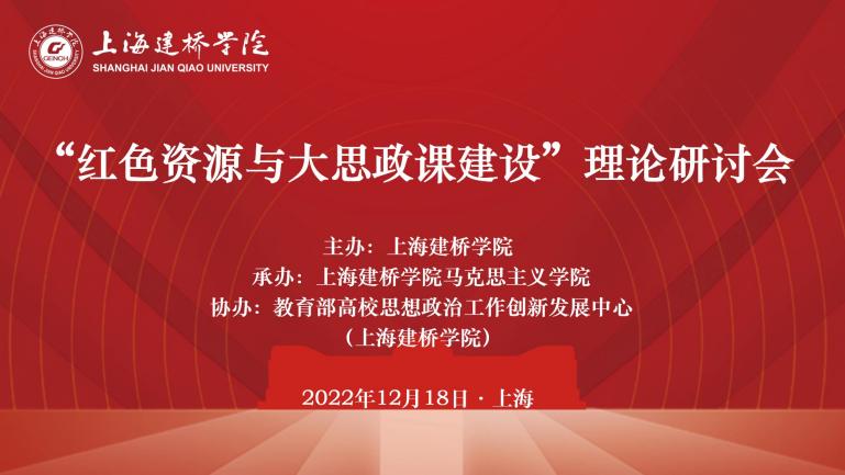 为深入学习贯彻党的二十大精神,切实落实习近平总书记关于“大思政课”建设的重要指示,持续推进善用红色资源融入“大思政课”建设的高校思政课改革和实践,探索思政课进入高质量发展新阶段之下如何利用好红色资源,更好发挥铸魂育人成效,12月18日,依托教育部高校思想政治工作创新发展中心(上海建桥学院),由上海建桥学院主办、上海建桥学院马克思主义学院承办的“红色资源与大思政课建设”理论研讨会在线上成功召开。