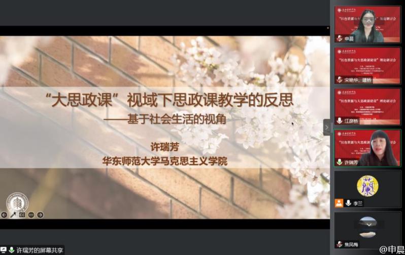 主题发言第二阶段,由上海师范大学天华学院马克思主义学院副院长丁彩霞主持。无锡太湖学院马克思主义学院院长陆启义以“红色文化在高校思政教育的运用价值及实践路径研究——以无锡太湖学院图书馆为例”为题,分享了学校红色文化资源融入思政育人的经验,进一步探索红色文化与思政教育的协同模式。辽宁财贸学院马克思主义学院院长李敏霞结合学校大型现代化综合性红色文化展馆“红馆”的建设和思政课实践教学创新举措,分享了探索大思政课的实践路径和经验,指出红色资源融入思政课要聚焦任务、紧贴内容、突出功效。南昌工学院马克思主义学院院长黄义灵以“传承红色基因争做革命传人—基于南昌工学院红色文化资源教学的实践探索”为题,结合如何将江西丰富的红色文化资源转化成优质的育人资源,以培养学生“坚定理想信念、铸就奋斗精神、激发学习动力”为目标开展思政教学育人的主要做法和取得成效进行了分享。福建阳光学院马克思主义学院院长杜云从党建与大思政课建设深度融合机制研究视角,从党支部建设、教育教学改革、队伍平台建设等方面介绍了该校的探索实践经验和思考。华东师范大学马克思主义学院副院长许瑞芳教授作总结点评,她指出,本阶段每个发言都是典型的大思政课建设特色案例,具有主题鲜明、做法可复制可推广、成果转化比较显著等特点。
