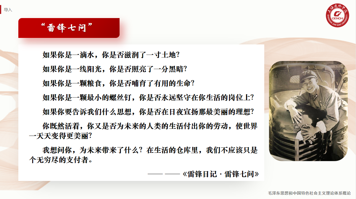 让课程丰满起来,塑造有灵魂的思政课程。课堂教学过程中,申老师首先带领同学们共同回顾了全校师生和衷共济、共度难关的特殊时期,跟随着疫情期间涌现的雷锋奖章获得者的故事和身边的一批又一批典型雷锋式先进集体和模范人物的脚步走近同学们身边。接着,通过结合校史校训“感恩、回报、爱心、责任”价值旨归,从雷锋青年时期日记写下的“雷锋七问”故事切入,以“心所向,道所至——坚定理想信念、责所在,情所系——增强责任与担当、德所在,志所成——锤炼精神与品格、行所至,才所达——强化本领与能力”四节教学内容设计,内容逐步深入,情感层层递进,并结合中国优秀传统道德文化和二十大报告精神,着重讲解了雷锋精神不同时期的时代化内涵诠释。既注重讲出深度力度,又讲出温度感情,用雷锋赤诚纯洁的家国情怀激励学生、启发学生。