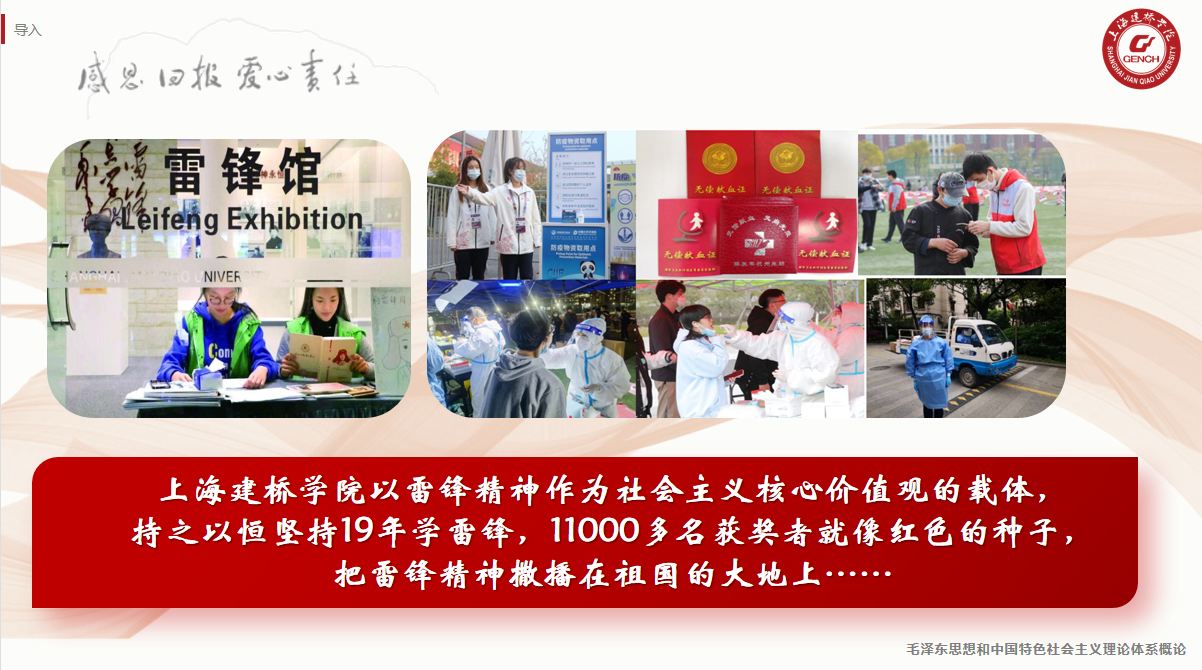 健康管理学院楚旭东同学通过结合自身专业谈到疫情期间在社区进行志愿服务的经历,谈到雷锋精神并未远去,雷锋精神的践行者如雨后春笋,正在不断在社会涌现。他们的实践,让雷锋精神更加熠熠生辉。学校里具特色的志愿服务也在蓬勃开展,让他时常能感受到爱的正能量在身边不断升腾。教育学院何欣怡同学在课堂上为大家绘声绘色地讲述了雷锋一生的奋斗经历,各行各业的永远需要雷锋的“螺丝钉精神”。艺术设计学院周邹风竹同学以毛泽东诗词和《新时代 新雷锋》的诗歌朗诵,获得同学们一致称颂。在课堂营造了向上向善的氛围,展现了建桥学子的青春英雄气。
