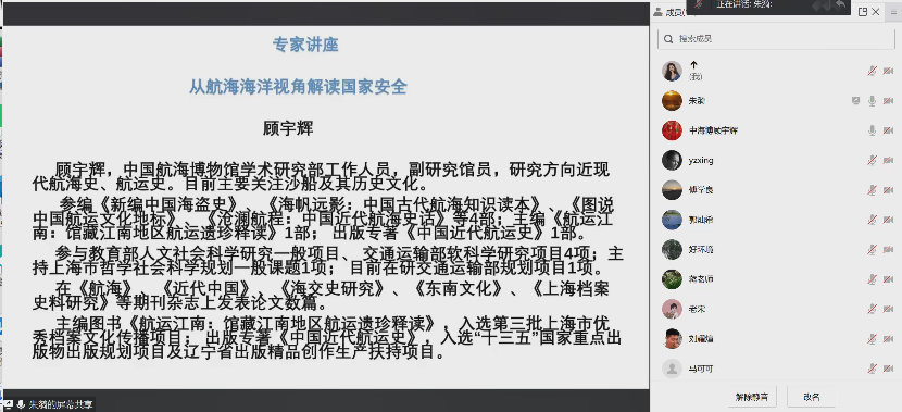 顾宇辉老师以“近代航运典藏研究体会”为主题分享了其在航海博物馆多年进行学术研究的工作经历、学术成长路径以及跨领域合作推动航海史与红色文化融合的未来工作计划。顾老师在讲座中对临港新片区各单位与航海博物馆通力合作促进学术研究的进一步发展表达了期盼,尤其希望能与拥有红色场馆的建桥学院加强进一步的合作研究,实现学术上的共同发展。