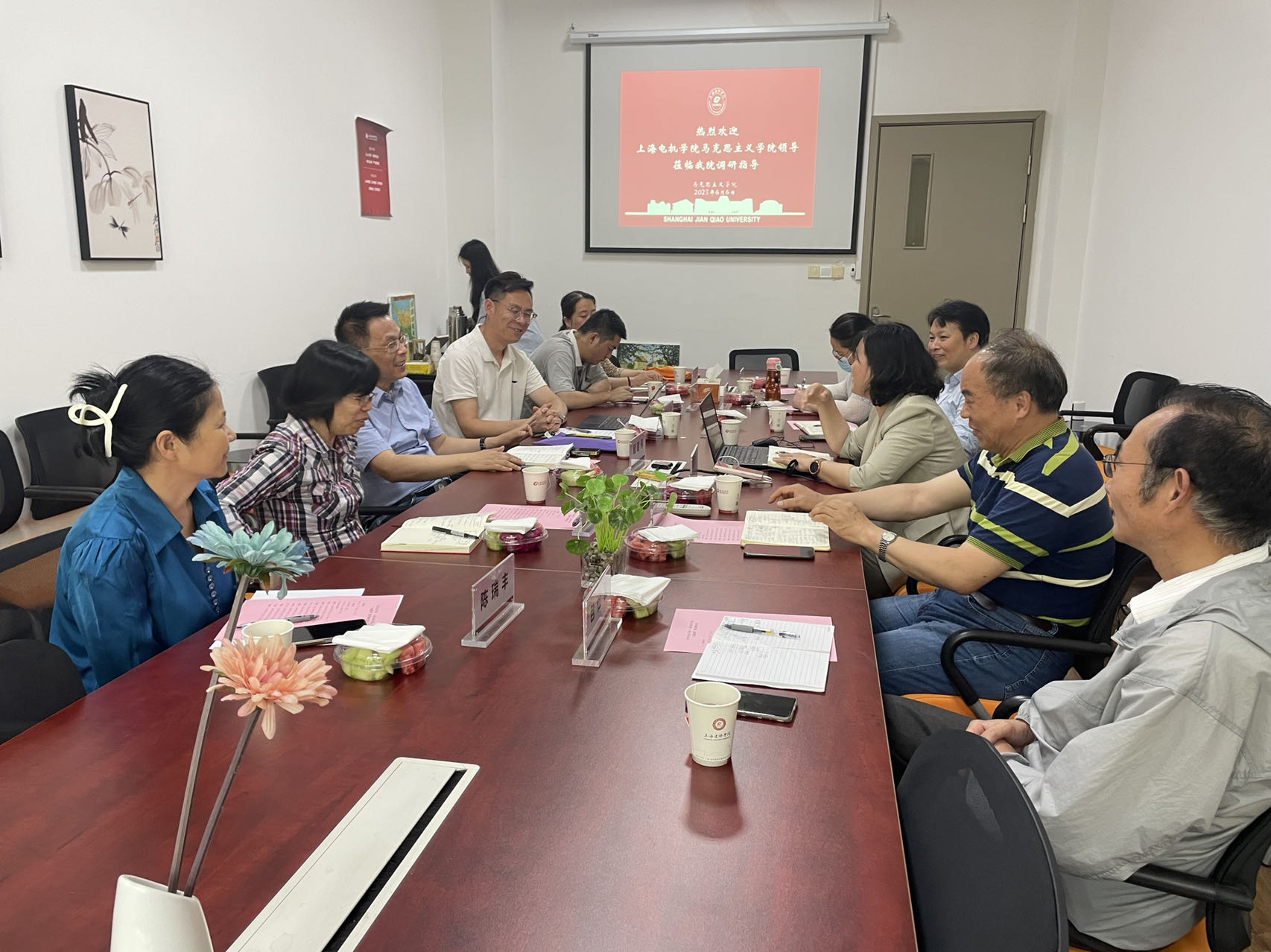 为了深入开展学习贯彻习近平新时代中国特色社会主义思想主题教育,加强高校之间思政课教学交流,全面推进大思政课建设,6月6日,上海电机学院马克思主义学院一行六人,在学院书记顾建伟和院长范冬姣带领下来我校马院进行调研,受到马院宋艳华、副院长沈树永的热情接待,马院课程组负责人参加了交流座谈会。