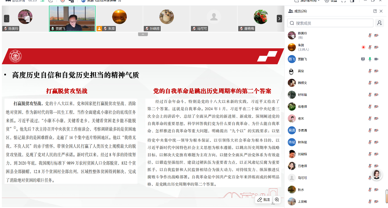 贾教授结合自己参与全国统编“参考讲义”的情况,系统介绍了讲好《习近平新时代中国特色社会主义思想概论》的教学经验。一是突出理论教学的针对性。要把思想性和理论性比较强的思政课讲出针对性和亲和力,要在讲深讲透和讲活上下功夫。讲述案例不能只是摆出事实,停留在面上,要针对性讲述,讲出案例中的道理,贾讲授列举了“第二个答案”等典型案例进行针对性的分析。二是要聚焦习近平思想的世界观和方法论开展针对性教学,挖掘各章知识里面蕴含的六个世界观方法论要点,着重分析六个世界观方法论的运用价值,探究规律性的东西,提高学生的思辨能力。三是要突出习近平思想中的创新范畴、重大命题和体系逻辑关系,特别要突出习近平的人民情怀、历史自信和世界视野。贾教授的报告对于我们搞好教学具有特别强的针对性和启发性,受到老师一致好评。
