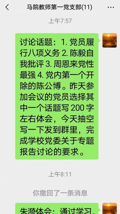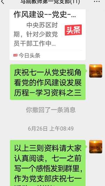 2025年7月1日,马克思主义学院教师第一党支部通过微信交流方式,举办了“庆‘七一’、学党史、谈感悟”主题活动。党员们认真学习了党的作风建设的发展历程、中央苏区时期党的作风建设、党史上的作风建设等学习资料,纷纷发表了自己的学习体会。