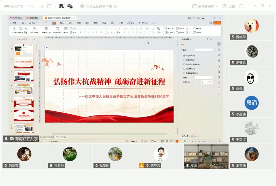 2025年10月8日晚,马克思主义学院形势与政策课程组依托腾讯会议平台,成功开展一场主题鲜明、内容扎实的线上集体备课活动。本次备课聚焦“伟大抗战精神”专题,特别邀请上海交通大学马克思主义学院邓涛老师作专题讲座,全体形势与政策课程授课教师齐聚云端、共同参与,聚力探索伟大抗战精神融入课堂教学的新路径。此次备课会由上海建桥学院形势政策教研室副主任蒋成凤老师主持。