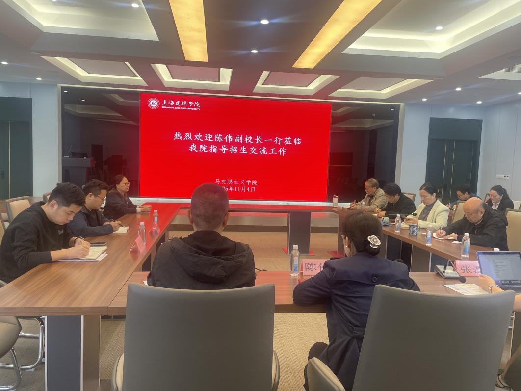 2025年11月4日上午,上海建桥学院副校长陈伟、校长助理张巍、招办主任张磊、招办副主任钟子健、招办专员颜世浩一行莅临马克思主义学院,专题调研并指导学院2026年招生宣传工作。马克思主义学院与创新创业学院党政领导及招生工作骨干教师共同参会。