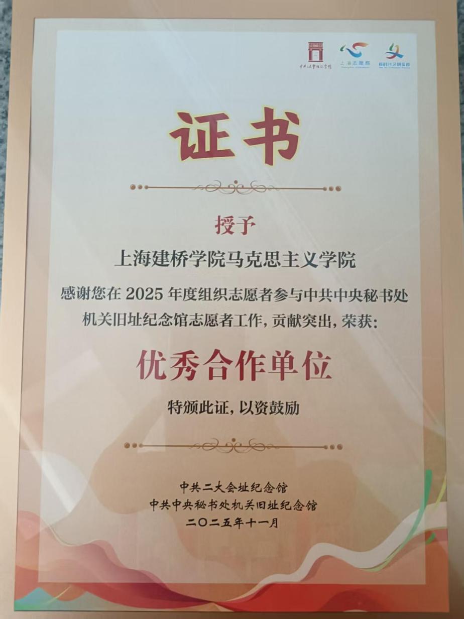 2025年11月15日,中共二大会址纪念馆举办“志愿同心 公益领航”2025年志愿者总结大会。马院荣获中共中央秘书处机关旧址纪念馆优秀合作单位称号,马院朱漪、商学院杨敏、机电学院李瑶荣获卓越组织者称号。