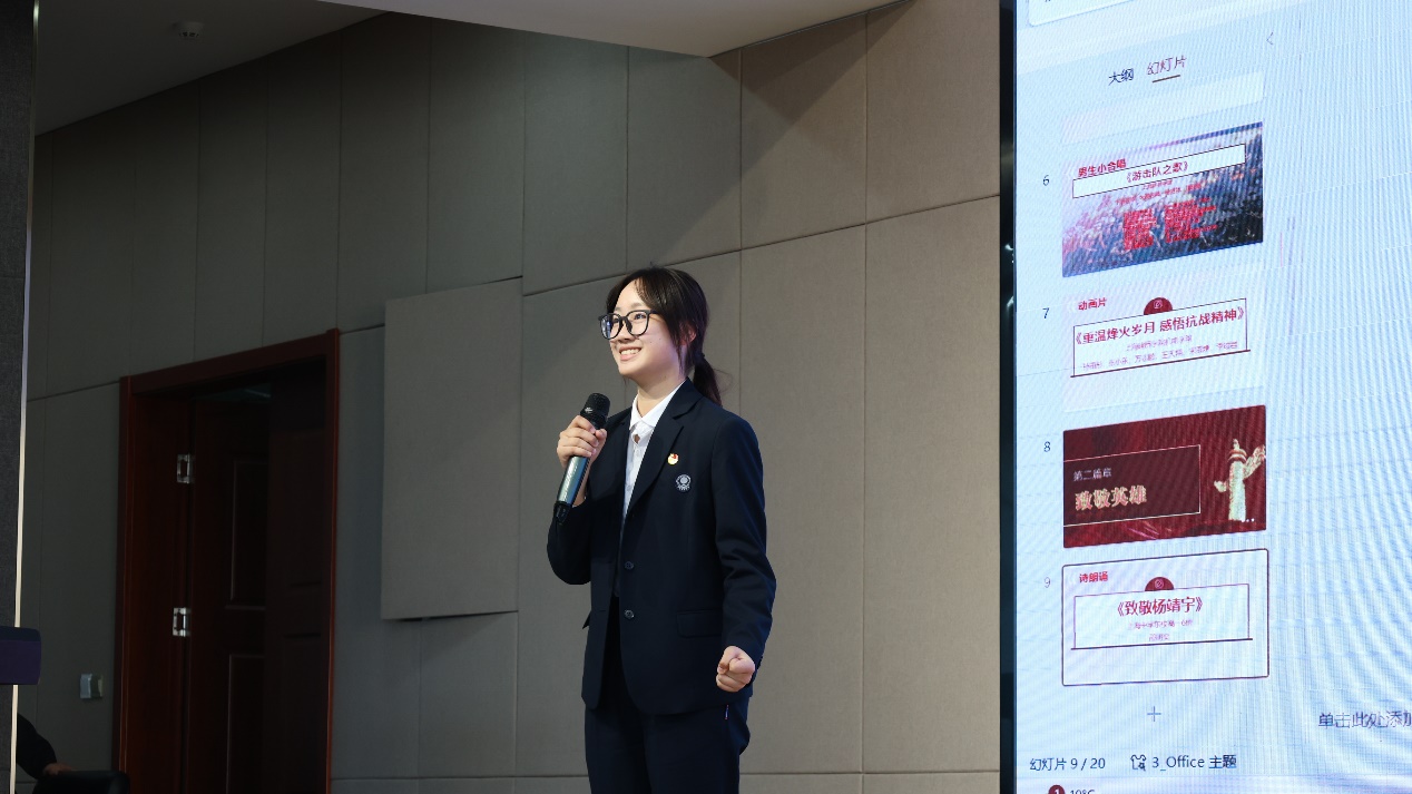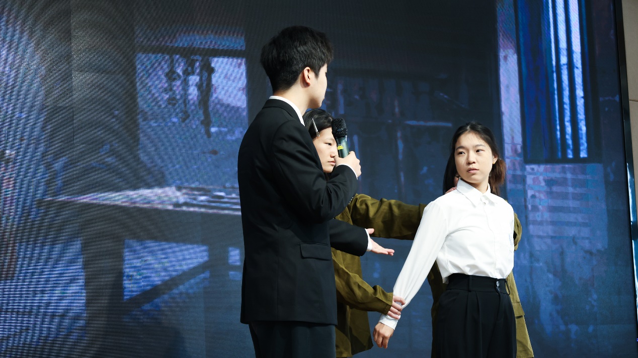 上海中学东校高一<6>班邵明奕同学用抑扬顿挫的声音诗诵了《致敬杨靖宇》,全场报以热烈掌声,表达了大中小学生无比敬仰英雄的心情。商学院封高怡、王鑫垚、严嘉俊四位同学用情景剧的形式展现出了抗日女英雄陈康容舍小家为大家、英勇就义的伟大形象,表演生动,情感真切,深深感动了现场师生。
