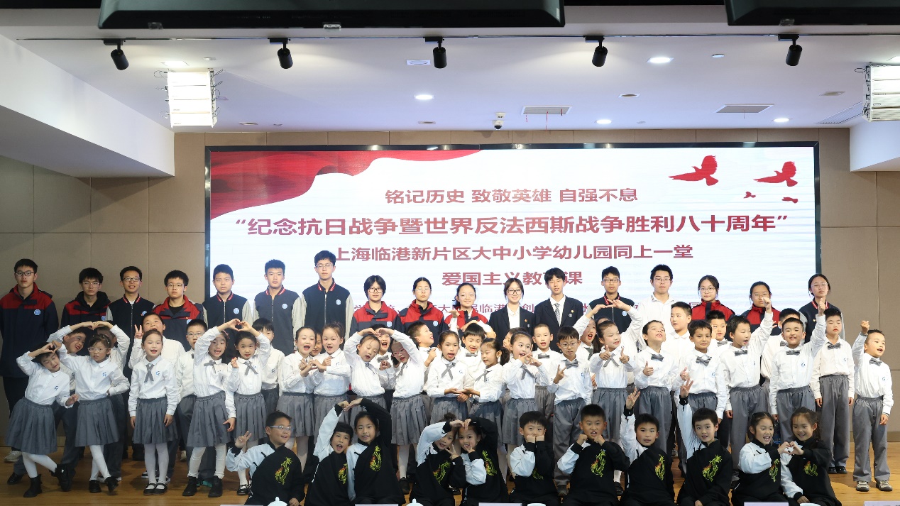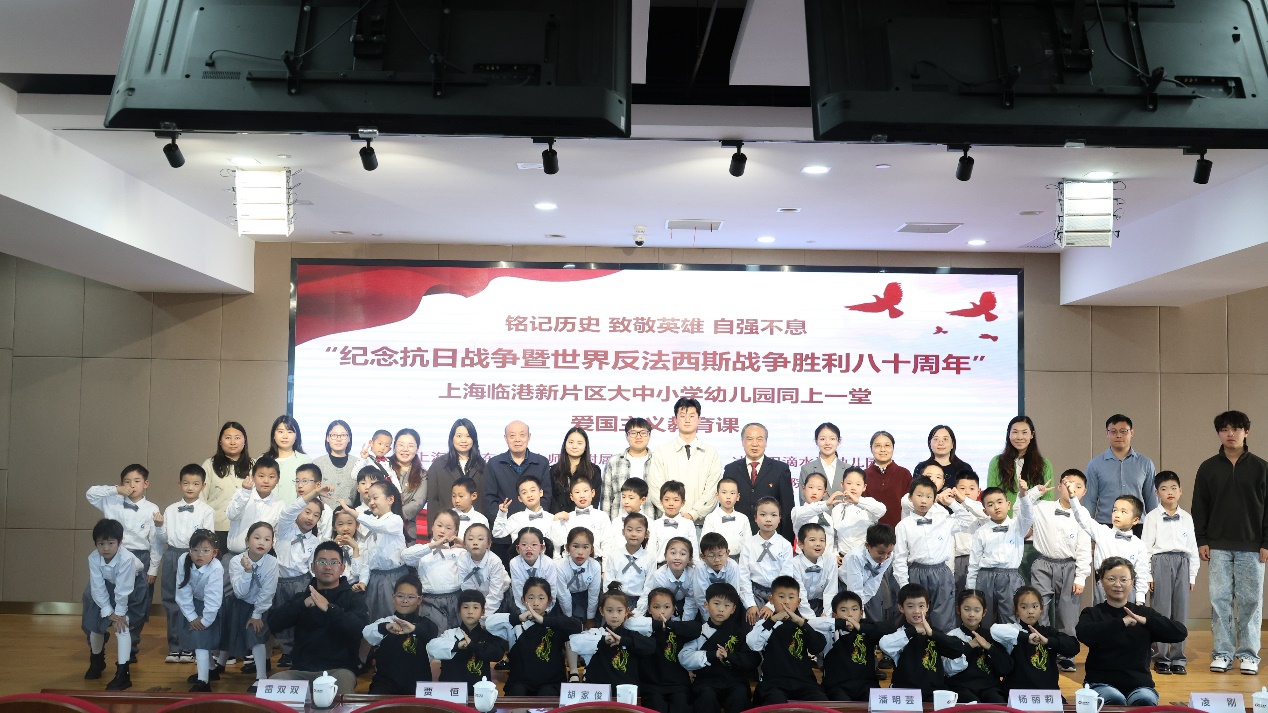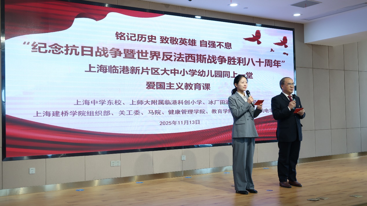 2025年11月13日,上海建桥学院举办“纪念抗日战争暨世界反法西斯战争胜利八十周年”上海临港新片区大中小学幼儿园同上一堂爱国主义教育课。上海建桥学院、上海中学东校、上师大附属临港科创小学和冰厂田滴水湖幼儿园四所学校的师生代表参加了本次爱国主义教育课。本次活动也是我校主题党日活动展示会,二级学院基层党组织的党员代表观摩了本次主题党日活动。