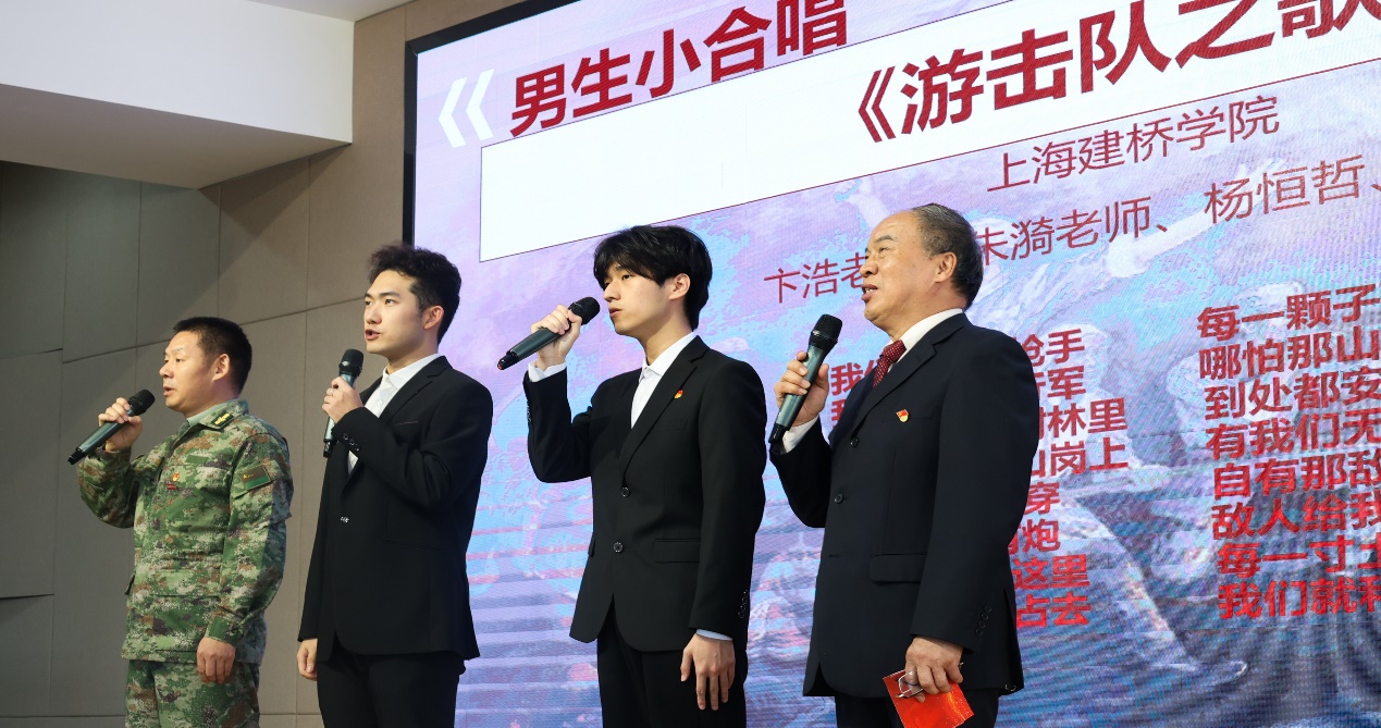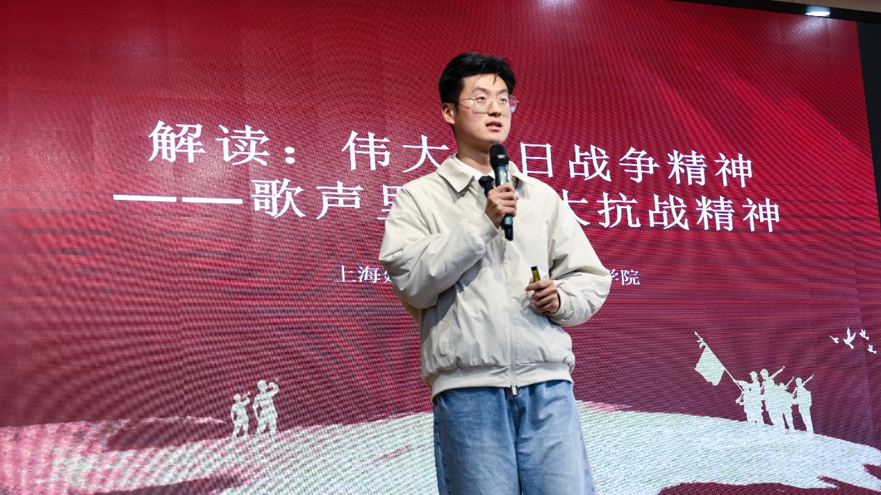 习近平总书记指出,伟大抗战精神是中国人民弥足珍贵的精神财富,永远是激励中国人民克服一切艰难险阻、为实现中华民族伟大复兴而奋斗的强大精神动力。马院穆凤麒老师用四首抗日战争歌曲诠释了伟大抗战精神,视角独特,简洁生动。上海中学东校高一<6>班徐郝添同学的演讲《自强不息》,表达了当代大中小学生为实现中华民族伟大复兴而刻苦学习、全面发展、早日成才的远大志向。健康管理学院张嘉芮学生演唱了《如愿》,动情好听的歌声表达了大学生实现美好梦想的志向,精彩演唱赢得热烈掌声。现场小学生齐声跟唱,情感互动十分感人。健康管理学院卞浩老师演唱了自己连夜精心制作体现“九三大阅兵”画面的歌曲《绿色军衣》,表达了众志成城、保家卫国的豪迈志向。