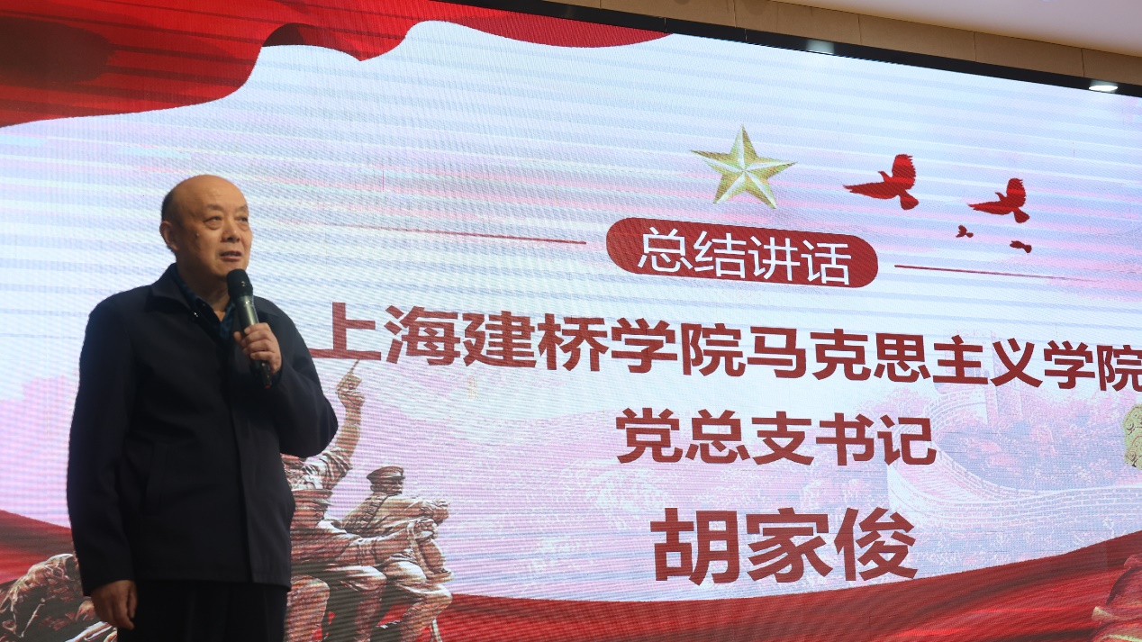 上海建桥学院马克思主义学院党总支书记胡家俊在总结讲话中指出,本次爱国主义教育课主题鲜明,形式新颖,内容丰富,以多样的形式表达了伟大抗战精神的深刻内涵,具有很强的教育性,是一堂高质量的思政课。他表示,马院要充分发挥牵头作用,提高站位,探索创新,深化大中小一体化思政课的品牌打造,把不同学段和各层级资源汇集起来,推进大思政课建没,更好地落实立德树人根本任务。