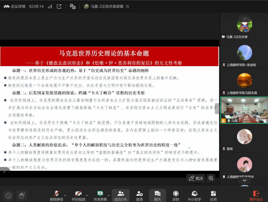 会议主要分教学报告和学术报告两个部分。在教学报告环节,来自复旦大学和中山大学马院的包炜杰、唐扬、徐伟轩、韩博四位老师分别围绕“基于马克思主义整体性讲好‘原理’课的若干思考”、“唯物史观下的道路之辩:为什么中国选择‘和平崛起’而非‘国强必霸’、“新质生产力理论融入马克思主义基本原理课程的教学实践思考”、“从经典到课堂:马克思主义宗教观的原著解读与教学转化”等主题进行教学思考的分享。