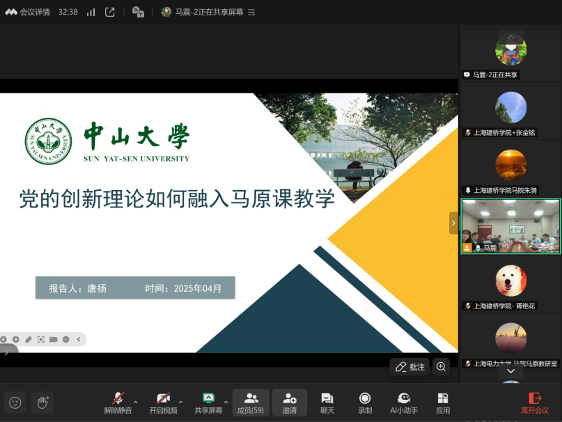 为深入学习新时代中国特色社会主义思想,推进党的创新理论进课堂,推进复旦大学马院和我院的深入合作,“原理”课教研室全体教师于4月3日下午参加了由复旦大学和中山大学马院联合主办的“学科交叉视域下的原理教学与研究”集体备课会暨青年教师学术沙龙。本次备课会采用线上线下相结合的形式,同时参会的还有来自江西师范大学、湘潭大学、海南师范大学等全国20余所高校马院专家学者和青年教师。